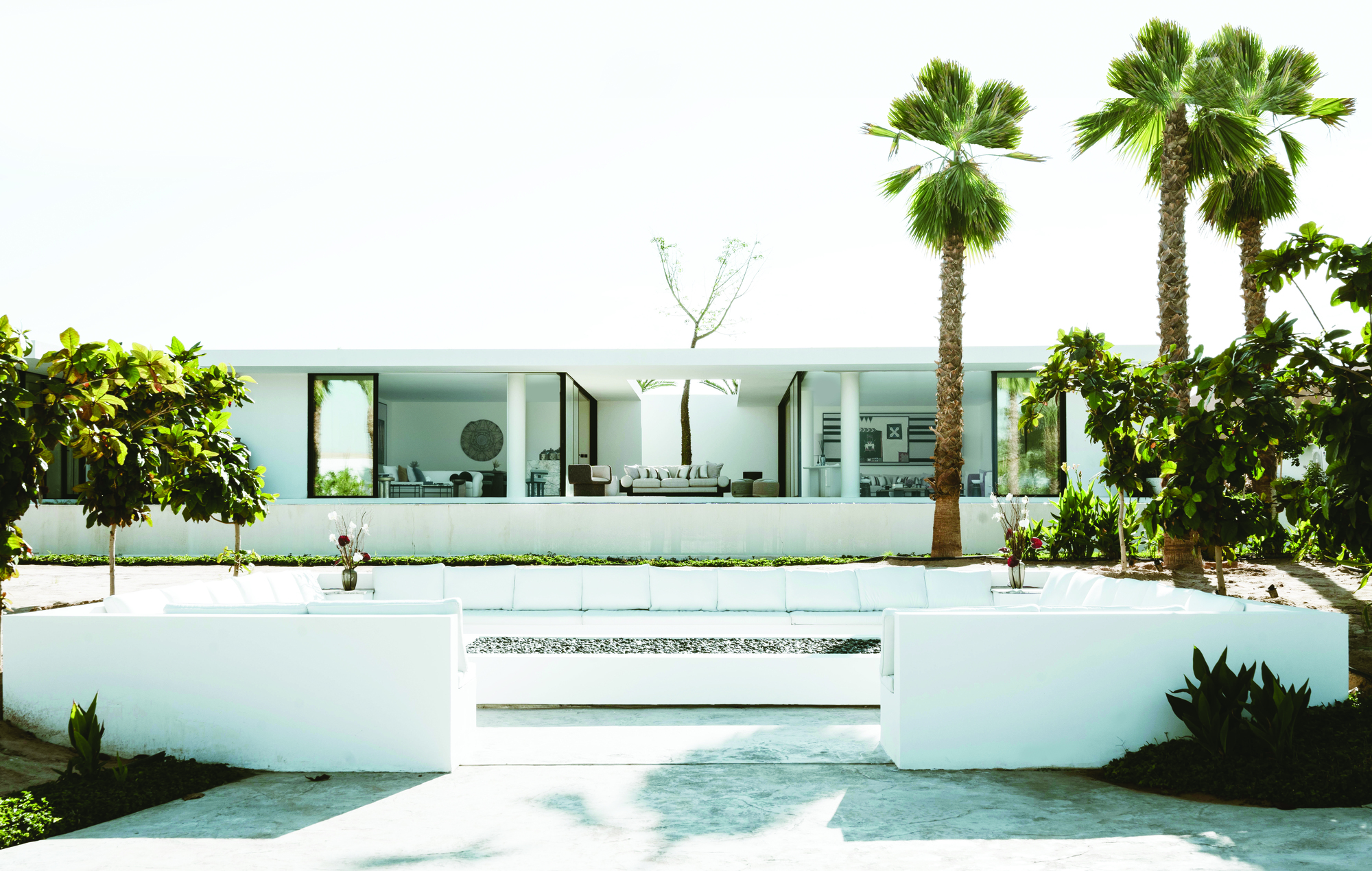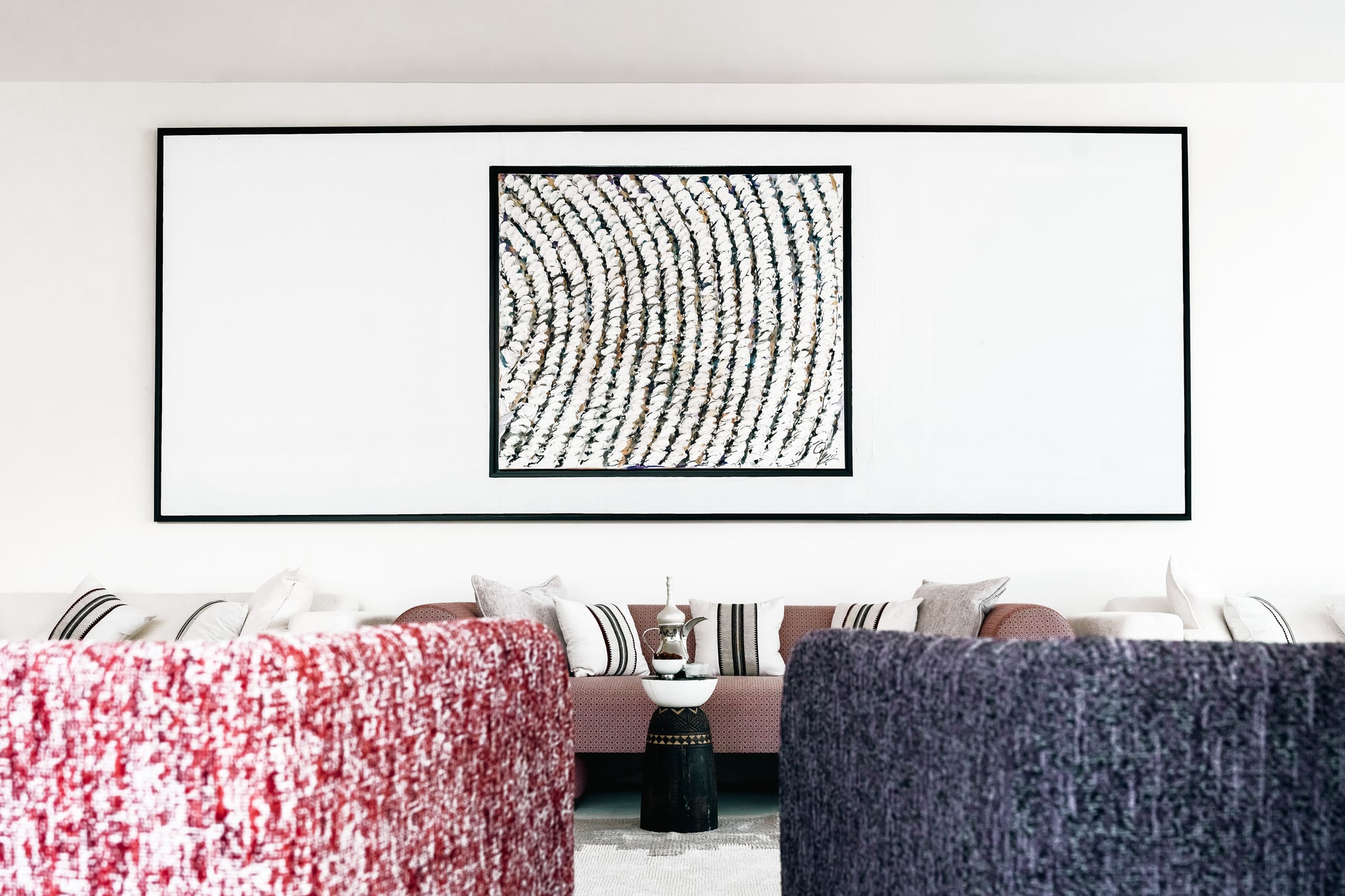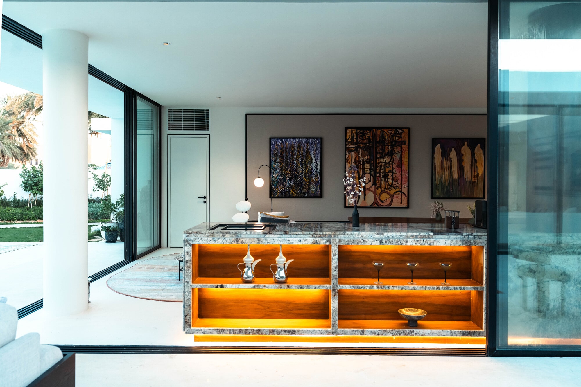فناء داخلي بشجرة يفصل بين أماكن المعيشة على جانبيه. غرفة المعيشة الرئيسية تصور الاحتفال بالتراث والثقافة السعودية، يليها منطقة لتناول الطعام. تندمج الأسقف البارزة معًا خلف الشجرة، لتخيط المساحتين في كيان واحد مما يخلق انتقالًا سلسًا بين المعيشة الداخلية والخارجية. كما أنها توفر الظل والحماية. تقع المساحات بشكل استراتيجي في الاتجاه الشمالي الشرقي لاستغلال صف أشجار النخيل وإطلالة تلال العيينة. محاولاً خلق إحساس بالسكينة والانفتاح والاتصال بالطبيعة.