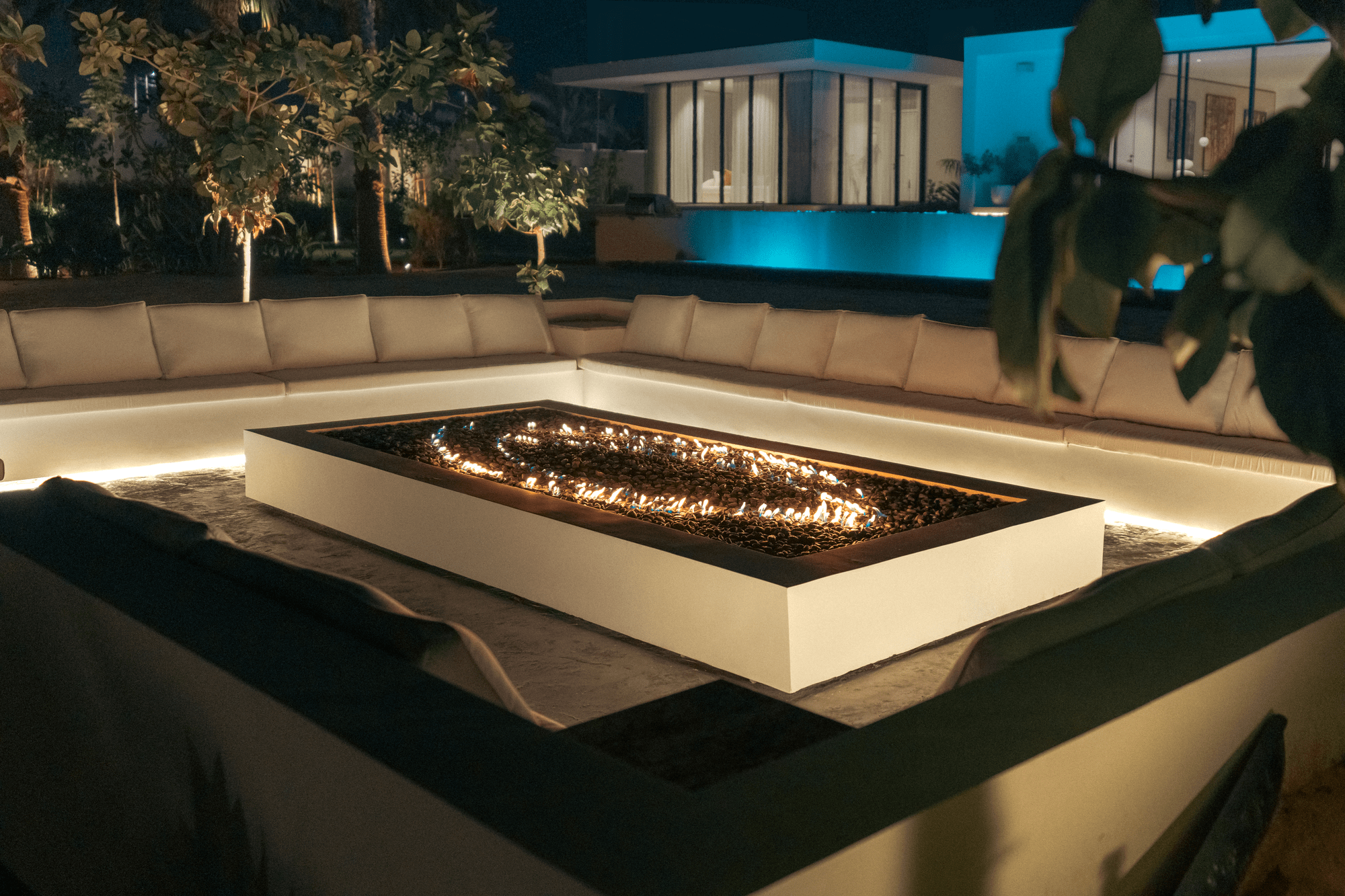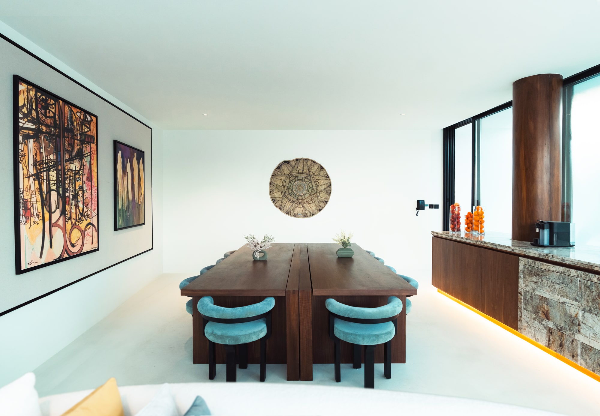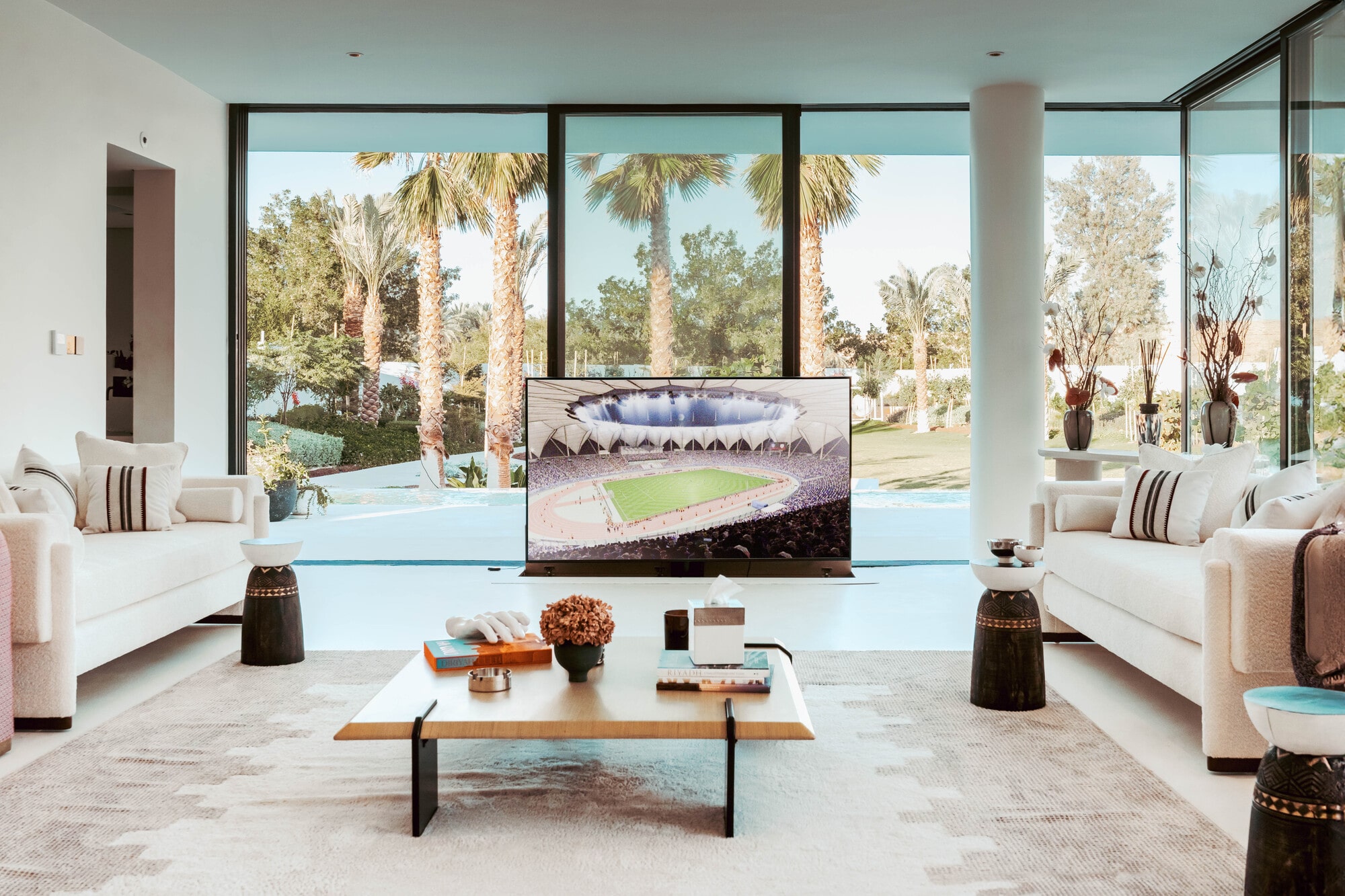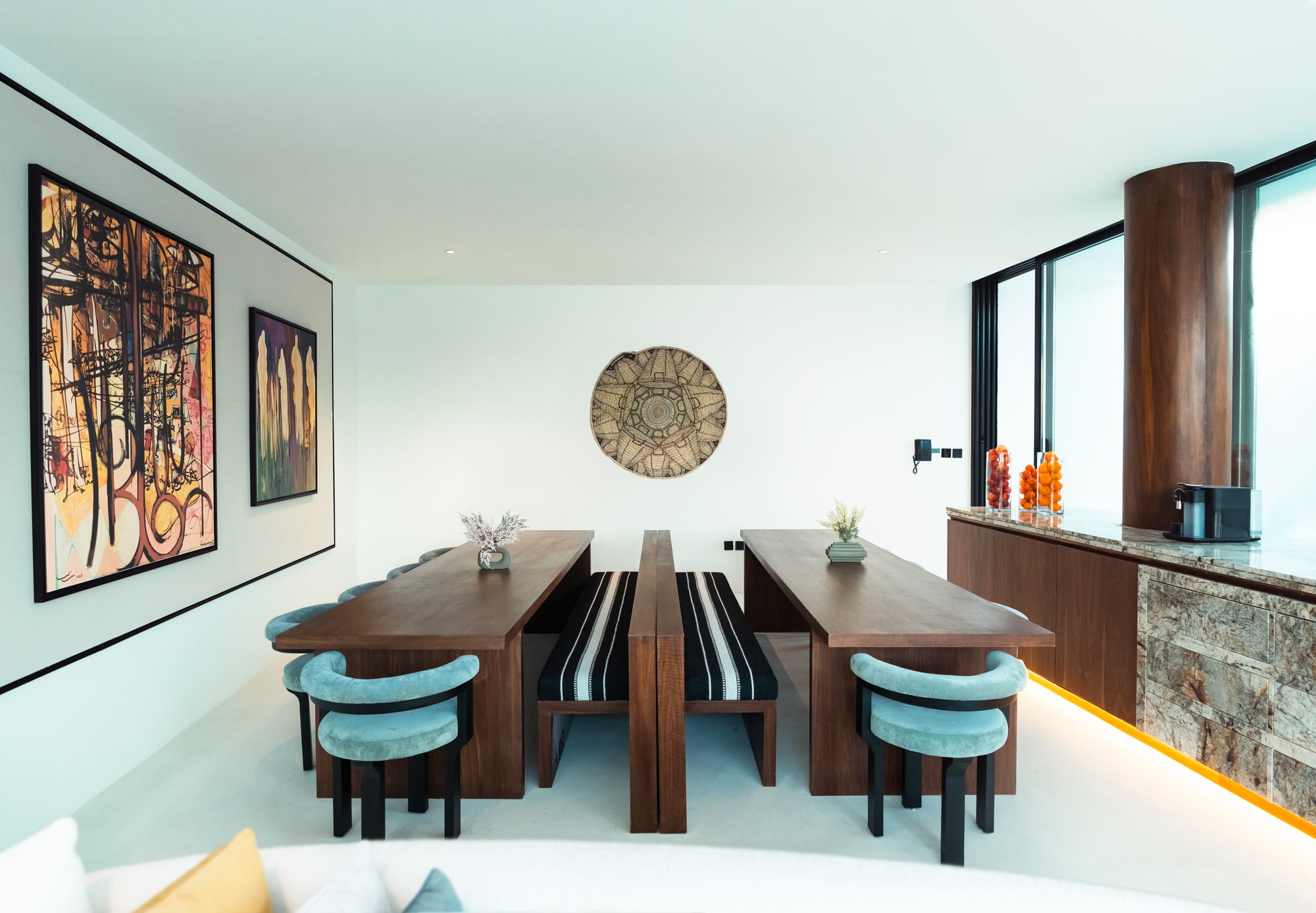 فناء داخلي بشجرة يفصل بين أماكن المعيشة على جانبيه. غرفة المعيشة الرئيسية تصور الاحتفال بالتراث والثقافة السعودية، يليها منطقة لتناول الطعام. تندمج الأسقف البارزة معًا خلف الشجرة، لتخيط المساحتين في كيان واحد مما يخلق انتقالًا سلسًا بين المعيشة الداخلية والخارجية. كما أنها توفر الظل والحماية. تقع المساحات بشكل استراتيجي في الاتجاه الشمالي الشرقي لاستغلال صف أشجار النخيل وإطلالة تلال العيينة. محاولاً خلق إحساس بالسكينة والانفتاح والاتصال بالطبيعة.