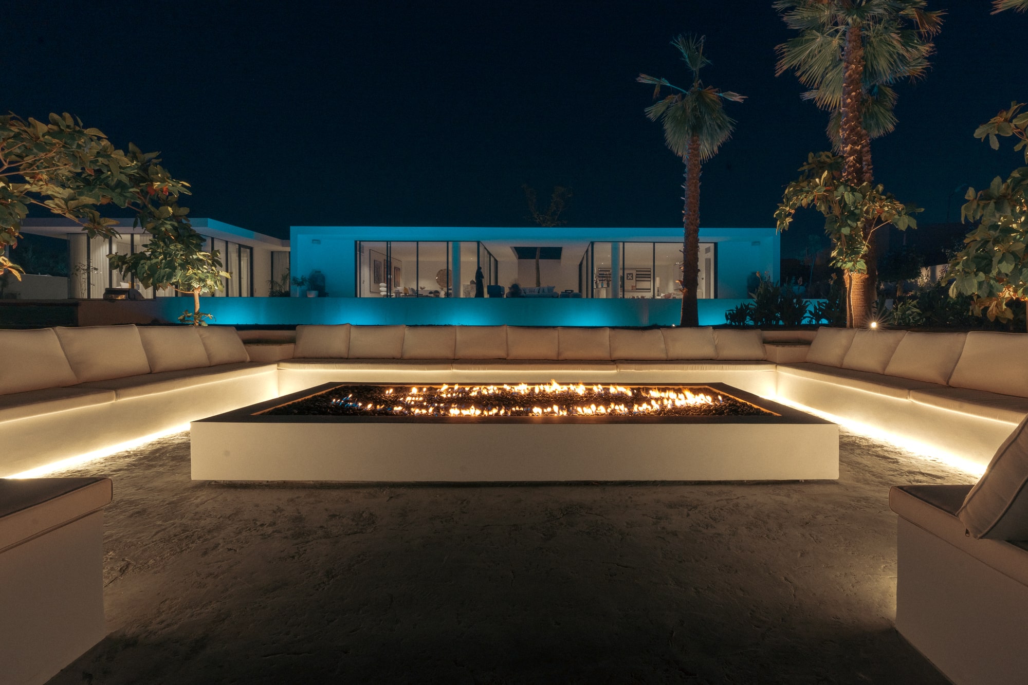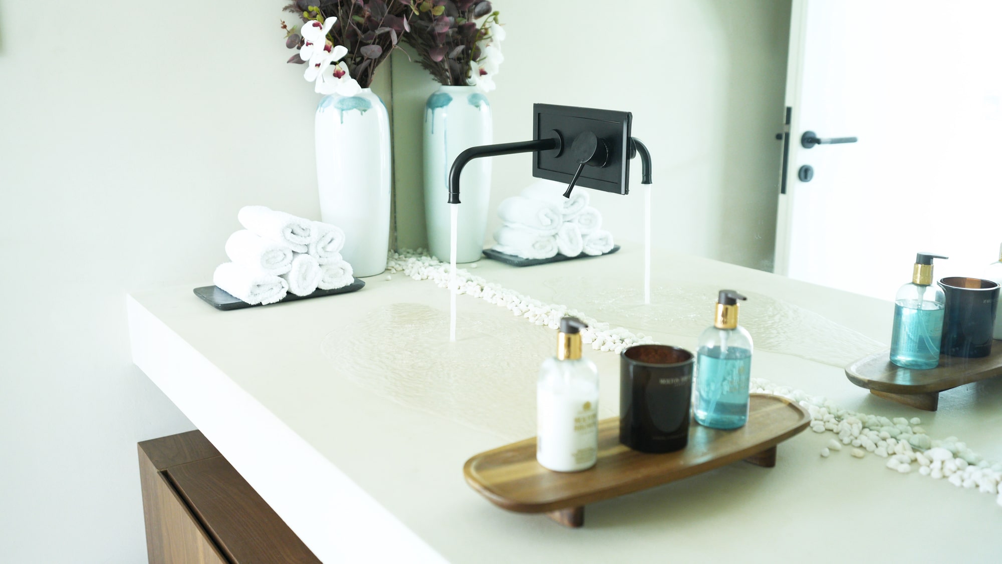 يقع المسبح على إطار العين نفسه، ليخلق إحساسًا بالتوازن والانسجام. يعمل المسبح أيضًا على تأكيد على اسم العيينة، الذي يعني عين الماء. ويتناقض مع التلال في اللون والطبيعة، منشأً مساحة ديناميكية ومثيرة بصريًا. يتدفق تيار الهواء الذي يبرده المسبح إلى الفناء ويخرج من خلال فتحة السقف محققًا تهوية طبيعية. يفيض المسبح بطريقة الـ(اوفرفلوoverflow ) لإنشاء شلال مائي لمنطقة الجلوس الخارجية أسفله. يخلق الشلال والنباتات واحة استوائية لمنطقة الجلوس الخارجية. توفر النباتات أيضًا الظل والخصوصية، بينما يصنع الشلال إحساسًا بالحركة والصوت.